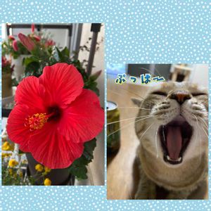 昨日はお休みやったので大掃除🧹🧼 スッキリ✨✨ まだまだ咲いてるハイビスカス🌺 労働の後の一杯🍺 私に代わりムギに表現して貰いました🤣 アシスタントありがとう💓