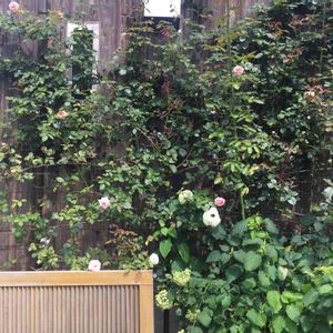 私の世話でも消えることなく、大きくなったピエール ド ロンサール 香りはないけど、壁を綺麗におおってくれました。 2番目の花咲き始めました。