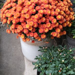 ひたち海浜公園の帰り、近くのジョイフル本田に寄り道… もうシーズン後半?🤔 特価品(¥550税込)のガーデンマムを発見。 まだしばらく見られると思わず購入…😊 玄関前に、実生の鑑賞用トウガラシと一緒に…