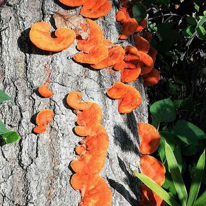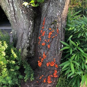 近所の街路樹にド派手なキノコが生えてた😂 目立つよね〜🤣 ヒイロタケかな🤔