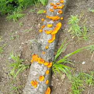 里山を登っていたら、倒木に鮮やかなオレンジ色のキノコ🍄発見😊 食べられないデス