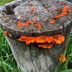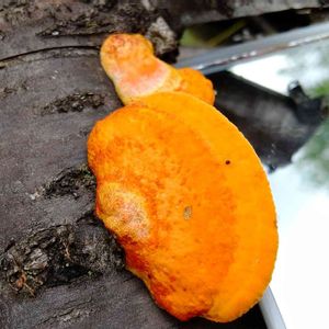 ヒイロタケかしら❓ それともシュタケ❓ 触ったら手に色がつきそうなくらいの鮮やかな朱色です🍄