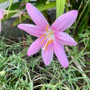 散歩道🚶♀️🚶🏻♂️ 緑道脇に咲くピンクの花 群生しています AI君教えて→回答→ゼフィランサス(サフランモドキ)
