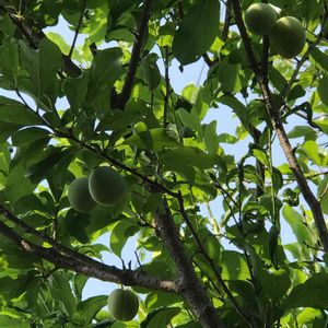 電球💡越しの空 😊 バックはスモモの木🌳 6勤終了ヽ(*´v`*)ノわ〜い