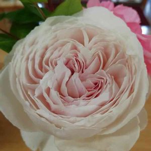 クリスティアーナ、咲き進んで中心が見えてきました。 うーっすらピンクが見えてます。 咲き始めは純白って感じで綺麗に真っ白です。 これからタグのようなピンクになるのかしら?