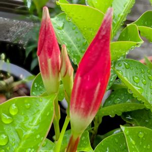 おはようございます。◕‿◕。 やっと蕾つけだしたマンデビラ ファション ウインク 情熱的な赤色 庭が華やぐ