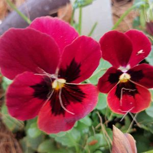 🌿💟ビオラ💟🌿 ミニ薔薇の鉢に こぼれ種から 可愛く咲いています。🤗 春のお顔より、 まつ毛も、おひげも、だいぶん長〰️いように見えます。 🤫お歳を感じます。😆 でもね❣️ 頑張っているの💕💕💕