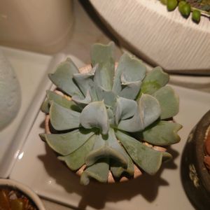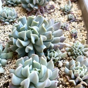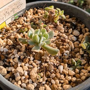 こんにちは☀️ 前に寄せ植えしたシルエットとだるま秀麗たち~ ミニセダムたちが徒長してきて、メインの3つが埋もれてきてしまい、鉢も倒れやすいので、植え替えることに。 よく見ると、美しかったシルエットが… 中央から2列目の葉が枯れてる😭 それに、その周りの列もポロポロと葉が取れてしまい… 可哀想な姿に😢 しょうがないので、 中央だけ残して、他の葉は葉挿しにしました😢 小さい方は、トップシータービーをメインに植えて、もう一つは、だるま秀麗丼😄 私の大好きなシルエットさん♡ ミニミニサイズになっちゃったけど(1枚目左下)、立派な根っこがあるので、また美しい姿になるのを期待~😆💦 今回は上手く植えられて満足~🙌🏻 ずーっと見ていたいゎ~☺️
