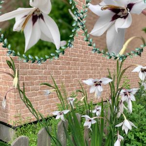 💕今日の我が家の小さな庭 💕 アヤメ科 グラジオラス属 アシダンセラ (アキダンテラ) (ニオイグラジオラス) (ピーコックオーキッド) (アビシニアグラジオラス) 花言葉 豊かな気品 純粋な愛 エチオピア🇪🇹原産 30~40種類の仲間が有る その中で、栽培されているものは アシダンセラ・ビコロル (グラジオラス カリアンツス)と その変種ミュリエリアエで 日本には1935年頃に 切り花用として入って来た 白から乳白色の5枚の花弁 それぞれの花びらの付け根に 目の様な茶褐色の班が入る 長〜く伸びた花茎に 5、6個の花をヤヤうつ向きかげんに咲かせます 一本でも見ごたえのある 植物です 🏷️