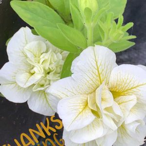 💕爽やかな色で安ら気を 💕 ペチュニア ギュギュ ダブルイエロー 中心がクリーム🍦色 白い花に薄いグレーのスジ とても可愛い(๑♡∀♡๑) 花です 花言葉 淡い恋 心の安らぎ あなたと一緒なら心が安らぐ 心の平安 元気な心 希望 友情