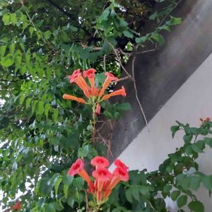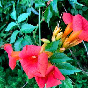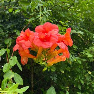 我が家の暴れん坊その1 ノウゼンカズラ(trumpet vine/トランペットバイン)です😆 朝写真を撮っていたらハミングバードが5羽も居て蜜を吸っていましたが、写真には収められず、残念でした。