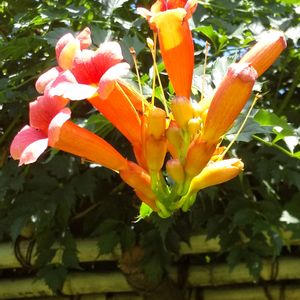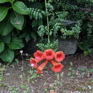 某所にお参りに行ったら、石垣に これ が垂れ下がってました。 始めて見る花。 ですが、手入れされてる風がない。 かなり生命力が強い植物みたいだと思い、GSに投稿し、AI様にお伺いを立てる事にしました。 そしたら、ノウゼンカズラかアメリカノウゼンカズラかのどちらかだと判明。 今度はGoogle先生にお伺いを立てました。 「どちらですかね〜」 花がラッパ型だから、北米大陸からいらっしゃった外来種。 アメリカノウゼンカズラにほぼ間違いないでしょう。 というお話でした。