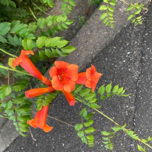 アメリカノウゼンカズラ🇺🇸 小学校フェンスに絡むこの花 通勤途中でこんなに派手な花なのに何故か目につきにくい😅❓ ノウゼンカズラ科ノウゼンカズラ属