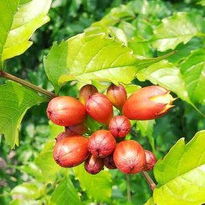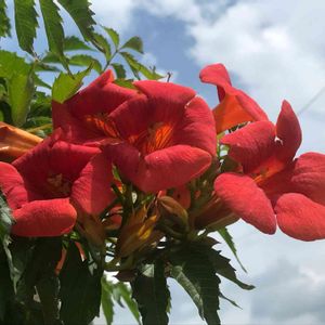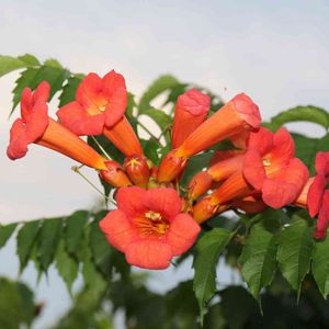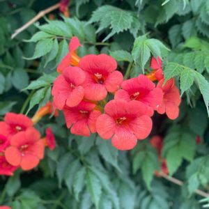 アメリカノウゼンカズラはオレンジ色のノウゼンカズラとそっくりですが、全体的に花が小振りで花筒が長いのが特徴です。 また、花序はノウゼンカズラのように長くならず1カ所に集まって咲いています。 楕円形の蕾から花弁段々伸びて咲いていきますが、飛び出す瞬間に"ポン"と音がしそうな不思議な光景です。 北アメリカ南東部原産。 ノウゼンカズラ科ノウゼンカズラ属の蔓性落葉低木。