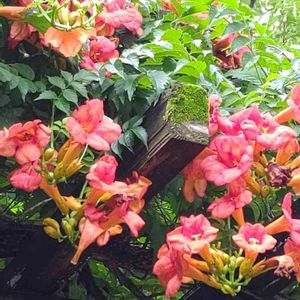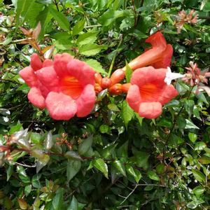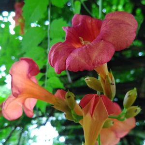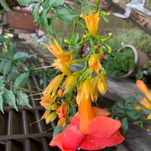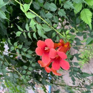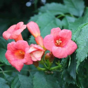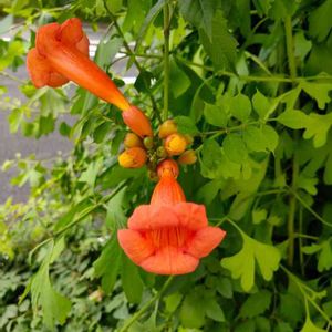 今日のお花より 🌱🧡アメリカノウゼンカズラ 別名:キャンプシスラディカン ノウゼンカズラ科 ノウゼンカズラ属 葉は対生で卵形をしている羽状複葉 花は集散花序に固まって茎頂に4~12個つき、色はオレンジ色か赤色で花喉は黄色みを帯びているそうです 雨が降っていましたが、服部緑地公園まで、このお花を初めとする撮影に行って来ました