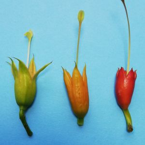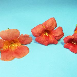 ノウゼンカズラ(左)の萼筒は緑色を帯び、アメリカノウゼンカズラ(右)は花冠同様、赤みを帯びています。マダム ガレン(中)はオレンジ色です。