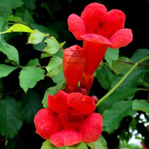 真っ赤なトランペット? アメリカノウゼンカズラの7cm位の派手目な花がぎゅっと集まって咲いています。でもこの密は大丈夫! 楕円形の蕾からポンと花弁が飛び出して次第に開いていく過程は、おもしろ可愛い! 北アメリカ南東部原産。 ノウゼンカズラ科ノウゼンカズラ属の蔓性植物。