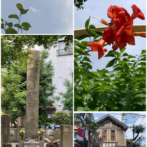 花散歩🚶♀️@東京都内🌺 梅雨の中休みで、良い一日でした✨ 近所で長い散歩をしてきました🚶♀️ 名所も意外とございます👍 ↖️実はウチの向かいの公園からでも 羽田新都心ルートに着陸する🛬 飛行機が見られることを発見👍 午後の幸せ✨ ↙️近藤勇と土方歳三の墓 実は近藤勇の墓は三箇所あります。 処刑されたここ板橋宿、生まれた在所の 三鷹、会津若松です。 今年は中止ですが新選組祭りも やっております👍 ↗️アメリカノウゼンカズラ ↘️名所✨実はこのあたりは 戦災で焼け残ったところで、古い建築も 残ってたりします✨ これは、かの亀の子束子本店 大正12年の建築です。 亀の子束子とは‼️ 亀の子束子は、1907年(明治40年)に西尾正左衛門により発明された、一定の長さに切ったスリランカ産の椰子の実の繊維(パーム)を針金に挟み、捩じって棒状にしたものを折り曲げて楕円型に成型したたわしである。 松下幸之助の「二股ソケット」、石橋正二郎の「ゴム足袋」と並び「日本三大発明」と称される。 Wikiより 実はこんなに偉大な発明だったんですね🤔 いまだに束子一本で存続している という企業の心意気もすごい👍