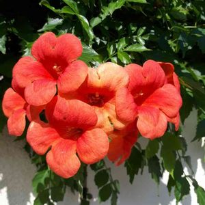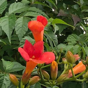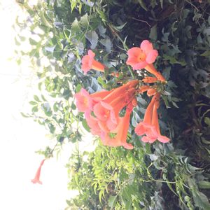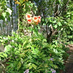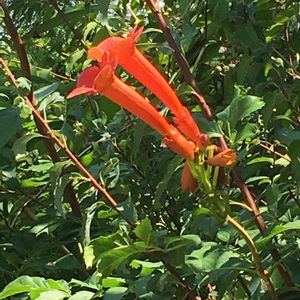 ノウゼンカズラ科ノウゼンカズラ属 学名:キャンプシス(CAMPSIS) “マダムガレン” 和名:アイノコノウゼンカズラ 20190806 作中西 アメリカノウゼンカズラとノウゼンカズラの交配種 ツルからぶら下がって咲いている💠 マダムガレンは父が広めたとか?…この手の種類は区別が付かない😓