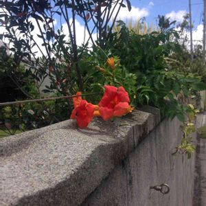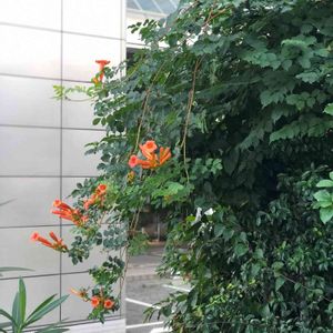 8/14(水)① 今日のお花 ノウゼンカズラ 7月の写真です。 今朝は快晴でしたが今小雨が降っています。 💠ノウゼンカズラ 💠ノウゼンカズラ科 💠ノウゼンカズラ属 💠学名 Campsis grandflora 💠英名 Chinese trumpet vine (チャイニーズ トランペットヴァイン) Chinese trumpet creeper (チャイニーズ トランペットクリーパー) 💠原産地 中国 日本には平安時代に渡来。 夏の季語。 💠和名 凌霄花(ノウゼンカズラ) 凌霄(ノウゼン、ノショウ) 意味「霄(そら)を凌ぐ花」 💠古名 まかやき (陵&草冠に召)と書く 💠落葉性のつる性植物。幹は太く藤に似ている。 夏から秋にかけ橙色、赤色 (園芸種にピンク、黄色)の大きな美しい花をつける。気根を出して樹木や壁などに絡みツルを伸ばす。 花や樹皮は漢方薬に使われる。 💠アメリカノウゼンカズラ ノウゼンカズラより細く小さな濃い色の花をつける。 アメリカノウゼンカズラは出先で、ノウゼンカズラはマンションの庭にもあります。