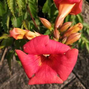 ノウゼンカズラです。 名前にある『カズラ』は、『ツル』を意味する語句であり、この植物がつる性の植物であることをしめしてます。『カズラ』は、ヘクソカズラやフウセンカズラ、ビンボウカズラ(別名はヤブカラシ)などの、ツルで伸びる植物の名前につけられてます。 英語名で『トランペット・フラワー』と言われます。