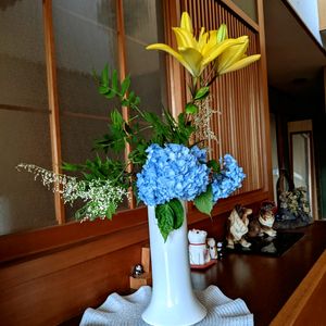 珍至梅、紫陽花、透かし百合今旬の花がさきました💙🧡💛💚さわやかです🍀😁