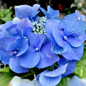 《紫陽花・ブルースカイ》 我が家に咲いている西洋紫陽花の💠ブルースカイ💠です。この紫陽花は、名前の通り真っ青な空色をした品種です。花は中央に両性花が集まり、その周りに装飾花がつくガク咲きのタイプです✨。 中央の両性花はぎゅっと集まっていて最初は黄緑色をしていますが、やがて装飾花と同じように青く色づいてきます。 装飾花は大きめですが、花びら4枚の一重咲きなので、重たくなることなくスッキリとしています😊💙。(直径が4㎝位にもなります。)