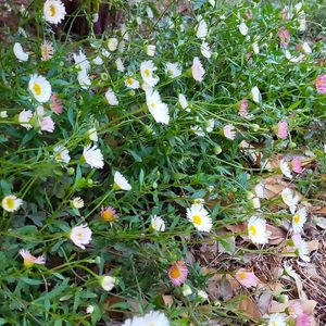 ご近所さんのお庭から、アチコチに、こぼれ種で野生化してるわ🌸🌼🌿 エリゲロン(キク科)別名 源平小菊 ペラペラヨメナ 白花がピンクに変化する、草丈10センチほどの、可愛いデージー🌼🌿