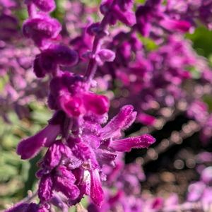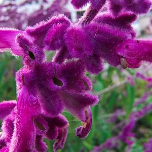 紫色のもふもふのお花。 アメジストセージ。 シソ科アキギリ属のお花。 サルビア・レウカンサとも。 もふもふ部分が萼で、そこから飛び出ているのが花びらとのこと。この子は赤みの強い花びらですね。花びらの奥に蜜線があり、甘〜い蜜を吸うことができます🤗