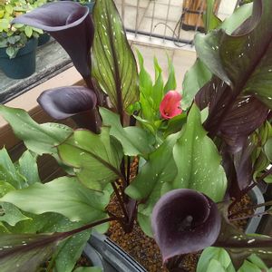 黒いカラーの花🤎 今日のお花❤️ カラーなのに黒いので目立ちませんゎ😅。後ろの赤いのもカラーです。 (水の森にて)