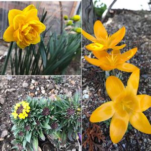 こんばんは 黄色いお花が咲き出しました。 左上ー水仙・ヒーモア 右ージャンボクロッカス 左下ー名前を教えて! 水仙ヒーモアは、2年目です。 今年も変わらない花姿💛嬉しいなぁ 右下のお花はご近所の散歩で。