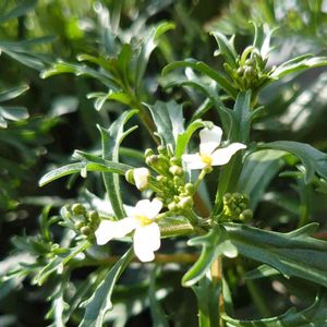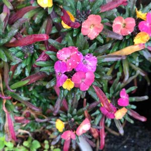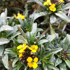 一年前に買ったエリシマム🌼 夏枯れすることが多いので一年草扱いらしいのですが、夏を越して年末から少しずつ咲きだしました。 バラの消毒がかかって白ブチです💧