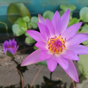 熱帯性スイレンが咲き始めました。メダカの赤ちゃんの中に入れてあります