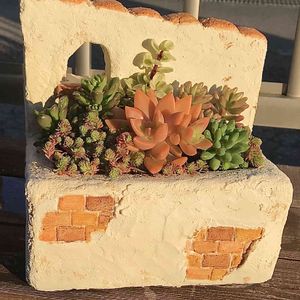 先日、自作のモルタル鉢に 寄せ植えしてみました。 気づけば夕方😅 夕陽に照らされる カリフォルニアサンセットがキレイ😊 レンガが…💦 もう少しうまく作れるよーになりたいなぁ😅