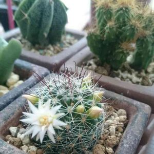 お高い訳でもなく、珍しい訳でもない普通~のサボテン、あのカーテンぶら下がりくん。私の中では思い出の君(笑) (覚えてくれてる方もわからない方もタグを見てね✨) 赤いトゲと白い蕾が~😆💕 絶好調のようです🙌