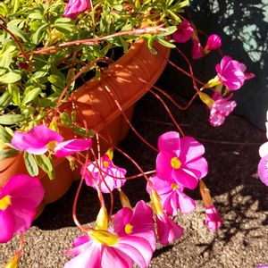 オキザリス2種類 桃の輝き イエロー 咲いてる時は中々撮れずで、やっと…😓 どの鉢に植えたか忘れたので、2種類一緒に植えました🤭 イエローは秋に求めた物、ピンクは昨年から、忘れて日陰に置いたから間延びしてます🤗