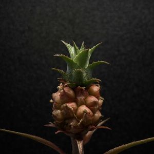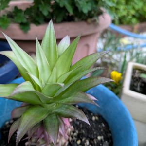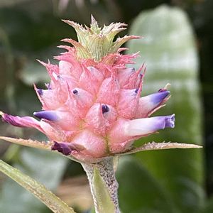 Ornamental Ananas. ハナパイン(ミニパイン)がひょっこり出来ました🍍 どこからどう見ても普通のパイナップル、違うのはサイズだけですね。 5cm程のハンディサイズで可愛いです。 厄介なのは耐寒性がやや弱いのと何より葉が痛いです。 葉が硬い上に反しが強力でちょっと触れるだけで刺さります。 触る時は手袋必須です。 花は初めて見ましたがなんとアントシアニンが含まれており青色になります。 調べて驚きました。 勉強になりますね。