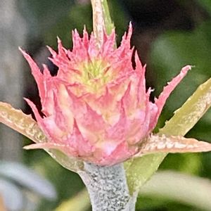 観賞用の小さなパイナップルです。 花苞がピンクに色付いてきました。 花はこれからです。 実ができることも楽しみです。