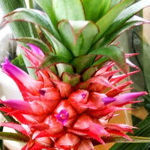 今月9日投稿のパイナップルに、花が咲きました。 紫色の小さな花です。 チランジアが、パイナップルの仲間だと言うことが、良く分かります。