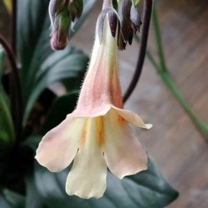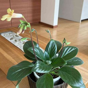 クリーム色のストレプトカーパスに似た花です 新宅の玄関で開花し、雨で居間に避難しました イワタバコ科のプリムリナアイコの花と教えて くれたtottokoさんありがとうございました❗