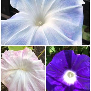 朝顔💜 色々😊 今年初めて植えた西洋朝顔 日本の朝顔と比べると薄くて大きいんですね🎶 やっと咲き出しました ちょっとシワシワだけど(๑˃̵ᴗ˂̵) 他の朝顔と一緒に🤗 上 西洋朝顔💙 左 我が家で咲いた西洋朝顔💗 右 朝顔 紫色がきれいでした💜 まだまだ蕾があるから、これから咲き出しそうで楽しみです💞
