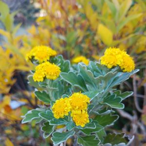 イソギクが今年も 咲きお庭に彩りをそえてくれてます✨ 白い縁取りの葉っぱも素敵です🌿 バックの クロバナロウバイの 葉っぱがいい感じに色付きました✨