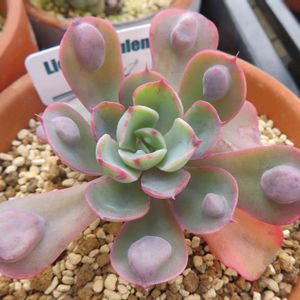 寒い時期だけど、ラウレンシスの子株が外れそうになっていたので、思い切って外して独立させた。よく見ると親株よりもきれいな色合いに。縁取りもいいけど、中心部の明るい緑の色が好みの色。 ちょっと見づらいけど、爪が2個ある葉が右の方に一枚あるのは突然変異?