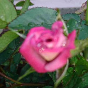 ミニバラ ラベンダー🌹 去年買ってから初めて咲いたよ🎶 2センチ位の小さな花❣️ 雨上がりで雨粒がきらり✨