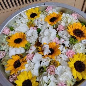 昨日午後の雨上がり、思いたって御井神社へお参りに🙏 ここは木と水、安産の神様ですが苦しい時の神頼み 主人は無事今日退院になりました😊 ①ヒマワリとアジサイの花手水🌻🤍 ②バラとカスミソウの花手水🌹🤍 ③父の日に向けたお花のアレンジ🩵 ④⑤梅雨にちなんだ傘のアレンジも☂️☂️☂️