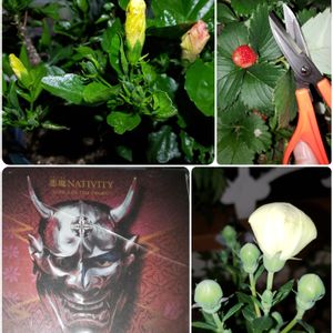 八重のハイビスカスは重くて?うつ向き加減です(^o^;) 左下の早朝は開く途中でギュッとしていました(*´∀`)♪ シクラメンの白咲きました(pq゚∀゚*○)
