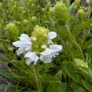 ウツボグサ シロバナウツボグサ 里山にて出会う白と紫♡💜 下から咲きだしている花は上が兜のようにこんもりと下唇にかぶさった唇形なのだけれど、蕾を包む苞もギザギザの唇形だ👄 秋までに何度も草刈りがあるので、夏枯草と呼ばれる枯れ姿にはお目にかかれないかも(^-^ゞ