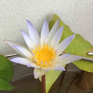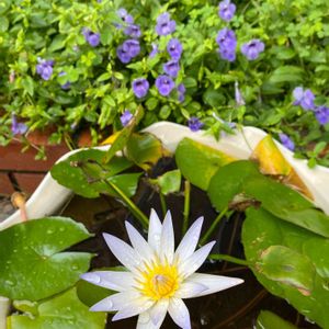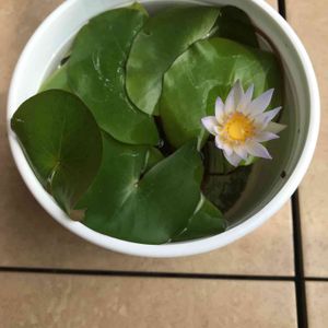 睡蓮鉢の中で熱帯睡蓮が初開花😊 スッゴく小さい花なのですが、睡蓮鉢の水は…お湯なんです‼️ よく育ってるなぁ~😅
