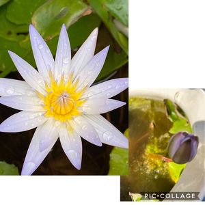 熱帯睡蓮 ドウベン。 外のドウベンが初開花です。 去年のミニ栽培の株が一番に咲きました。 コーチとムーンビームは花芽がついたけど停滞中☂️