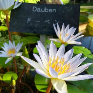 タグの名はミニミニドウベン 甘い香りがするスイレン✨ 白花で花びらの先は薄っすら紫色 涼しげな感じがします⁉︎